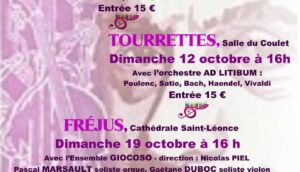 - Dimanche 19 octobre à Fréjus, avec le grand Concerto pour orgue, timbales et orchestre à cordes de Poulenc, à la Cathédrale Saint-Léonce.