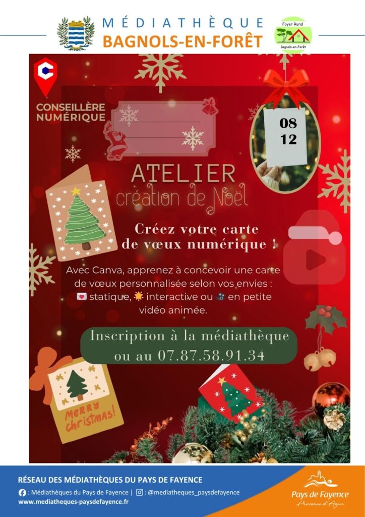 La Médiathèque du Foyer rural de Bagnols en Forêt vous propose un atelier spécial Noël pour créer votre propre carte de vœux numérique personnalisée 🎁💻 !