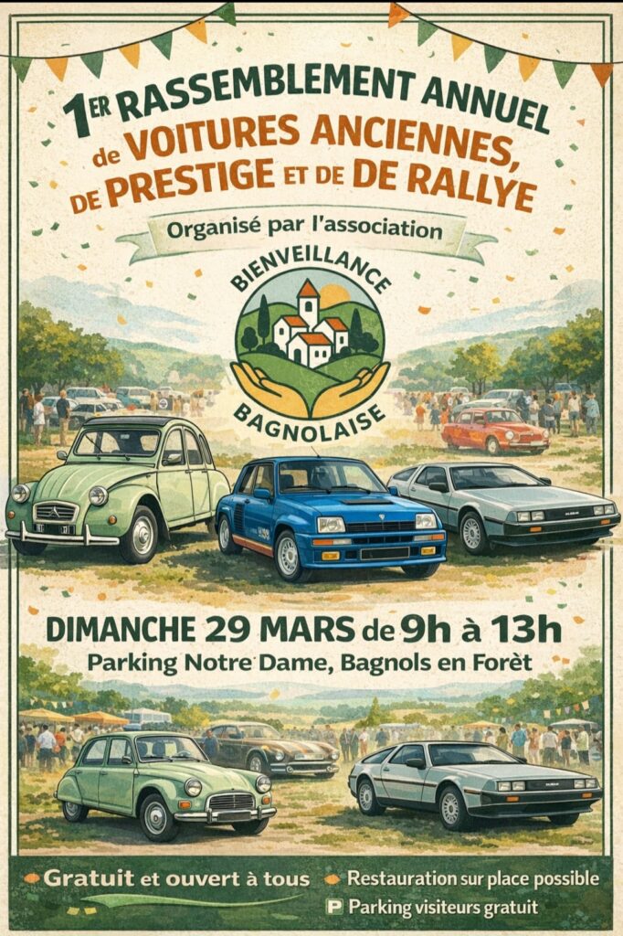 L’association Bienveillance Bagnolaise vous invite au premier rassemblement annuel de voitures anciennes, de prestige et de rallye