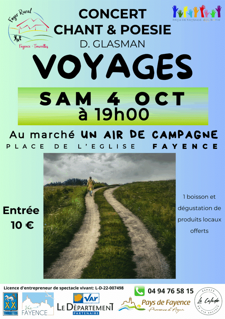 Le Foyer Rural de Fayence-Tourrettes vous invite à une soirée artistique unique avec D. Glasman autour du thème « Voyages ».