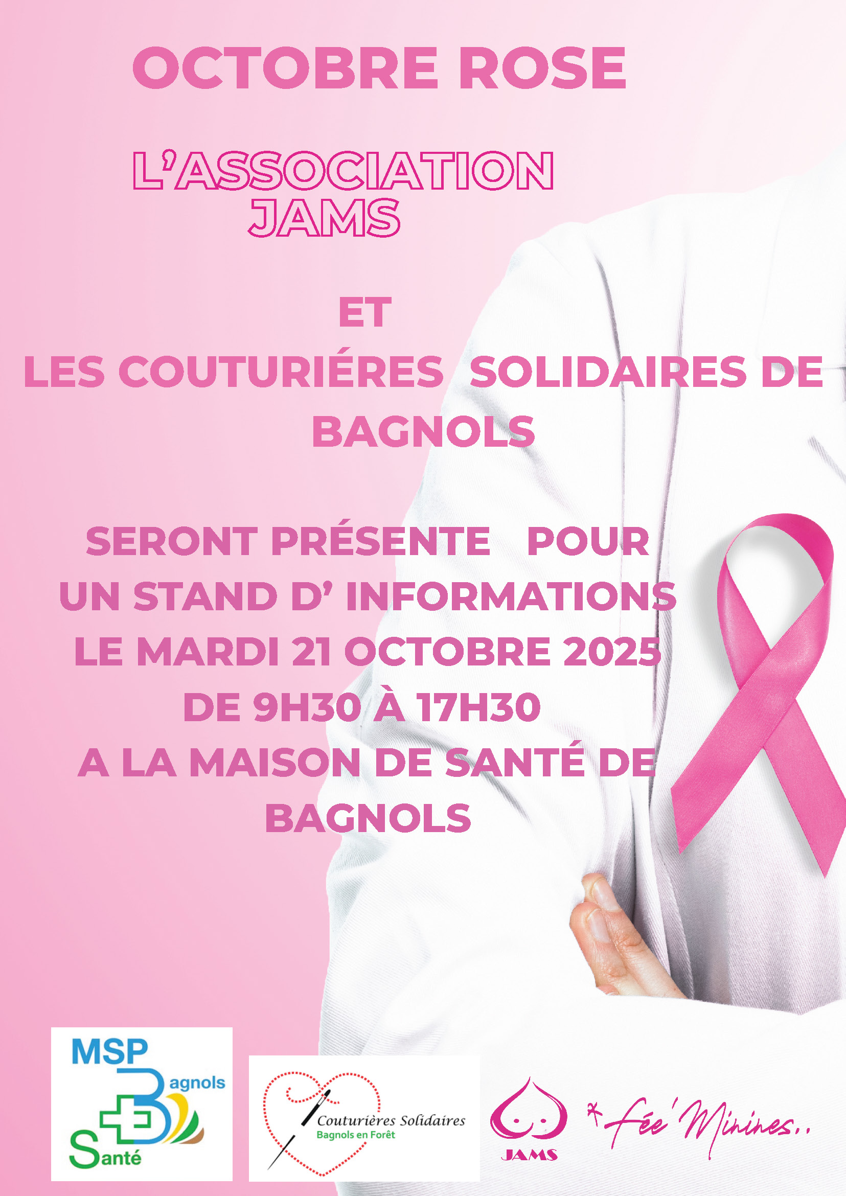 Dans le cadre d’Octobre Rose, mois de sensibilisation au dépistage du cancer du sein, l’association JAMS et Les Couturières Solidaires de Bagnols en Forêt vous donnent rendez-vous