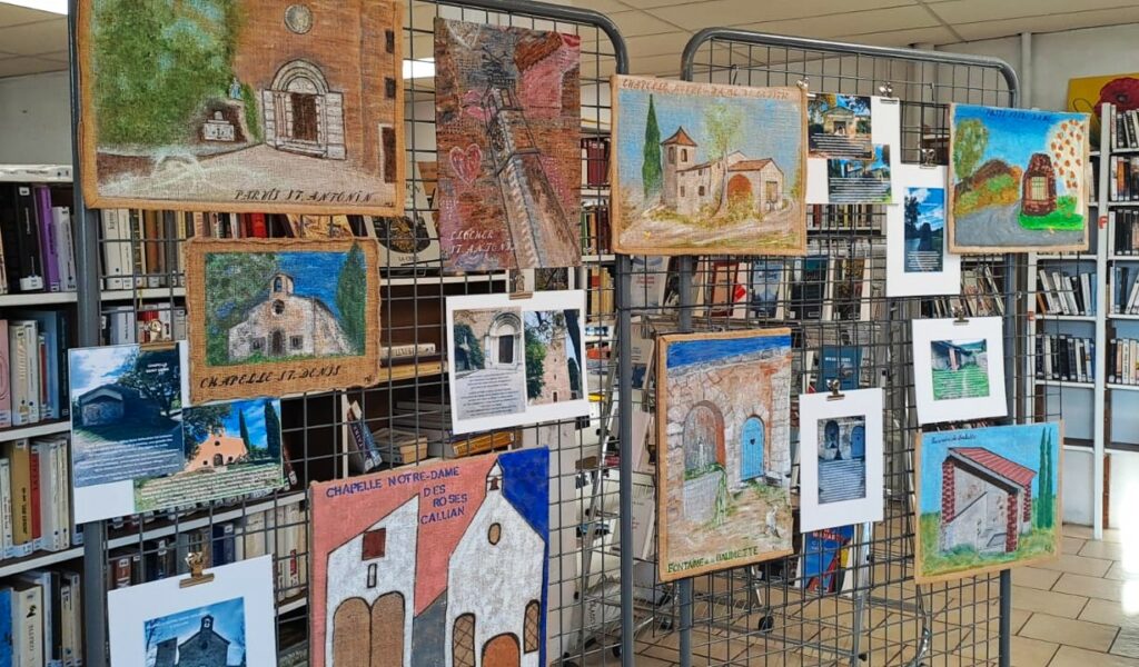 La Médiathèque du Foyer Rural de Bagnols-en-Forêt accueille pour sa dernière semaine une exposition originale et pleine de sens : des œuvres réalisées sur toile de jute, autour du patrimoine de notre village.