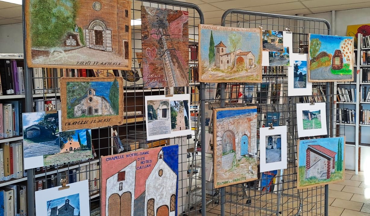 La Médiathèque du Foyer Rural de Bagnols-en-Forêt accueille pour sa dernière semaine une exposition originale et pleine de sens : des œuvres réalisées sur toile de jute, autour du patrimoine de notre village.