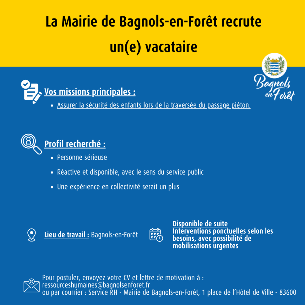 Dans le cadre de ses besoins ponctuels, la commune de Bagnols-en-Forêt recherche un(e) vacataire pour renforcer ses équipes dès que possible.